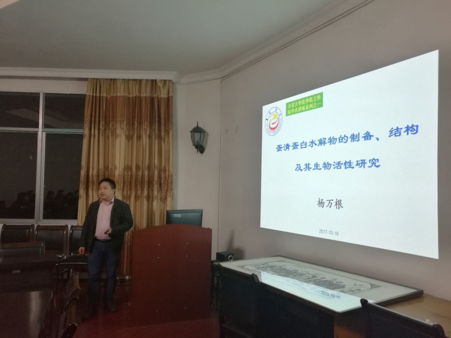 本网讯(华骏)10月16日晚,食品质量与安全教研室主任杨万根博士在yl6809永利学术交流中心为该院研究生作了学术讲座,该院部分老师、全体研究生、部分本科生到场,讲座由覃事栋副经理主持。杨万根博士带来了自己的研究工作——蛋清蛋白水解物的制备、结构及其生物活性研究,讲述了如何选题、研究思路、确立研究内容,详细介绍了研究方法和成果,分享了自己在科研过程中的心路和喜悦,并简单介绍了他近期关于湘西苗家酸肉的研究,《苗家酸肉发酵过程中微生物菌群结构的动态变化与香气物质形成的关系》获得2017年国家自然科学基金资助。与会师生与杨万根博士进行了互动交流。